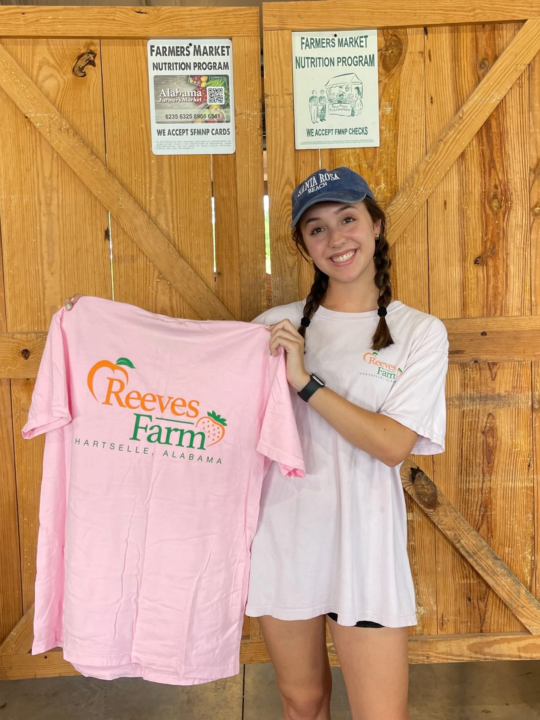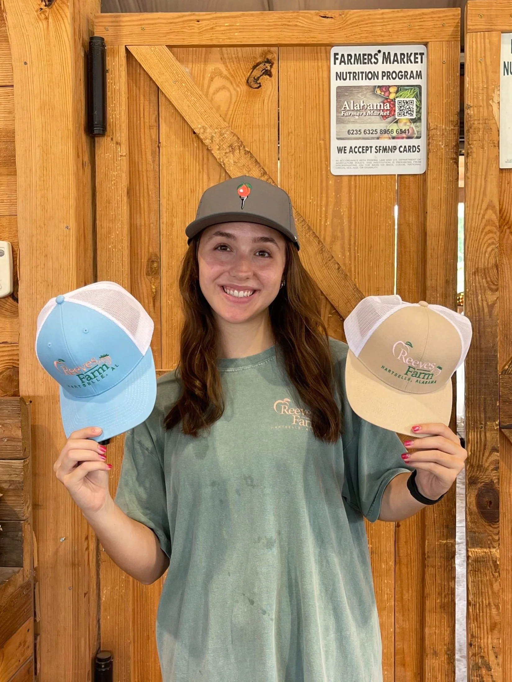 Calling all hat lovers! We’ve got a variety of ball caps and trucker hats for sale. They come in a variety of colors and styles, many featuring the Reeves Farm logo. One of our personal favorites is the golf tee peach hat!